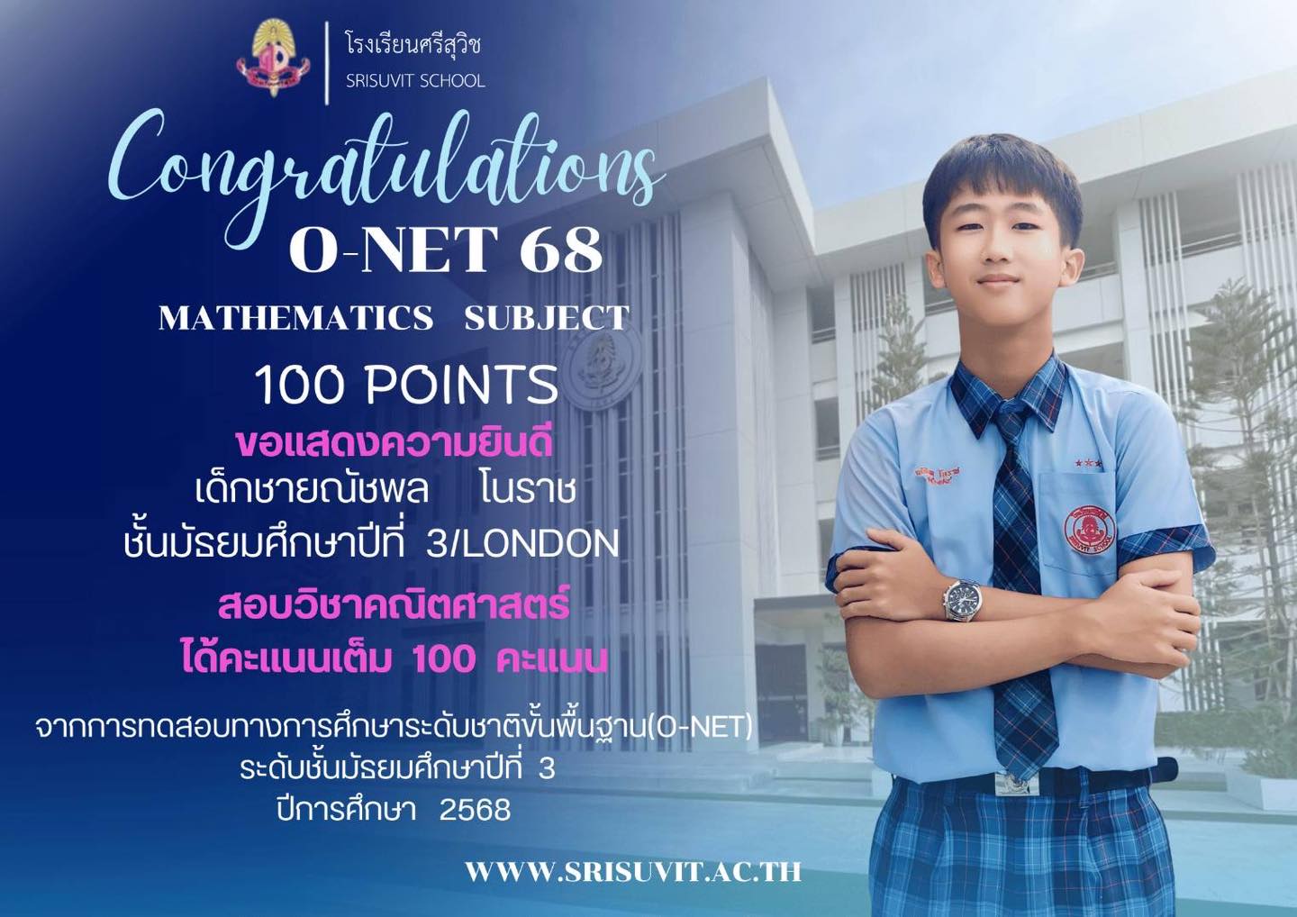 ขอแสดงความยินดีกับ เด็กชายณัชพล โนราช ชั้นมัธยมศึกษาปีที่ 3/LONDON